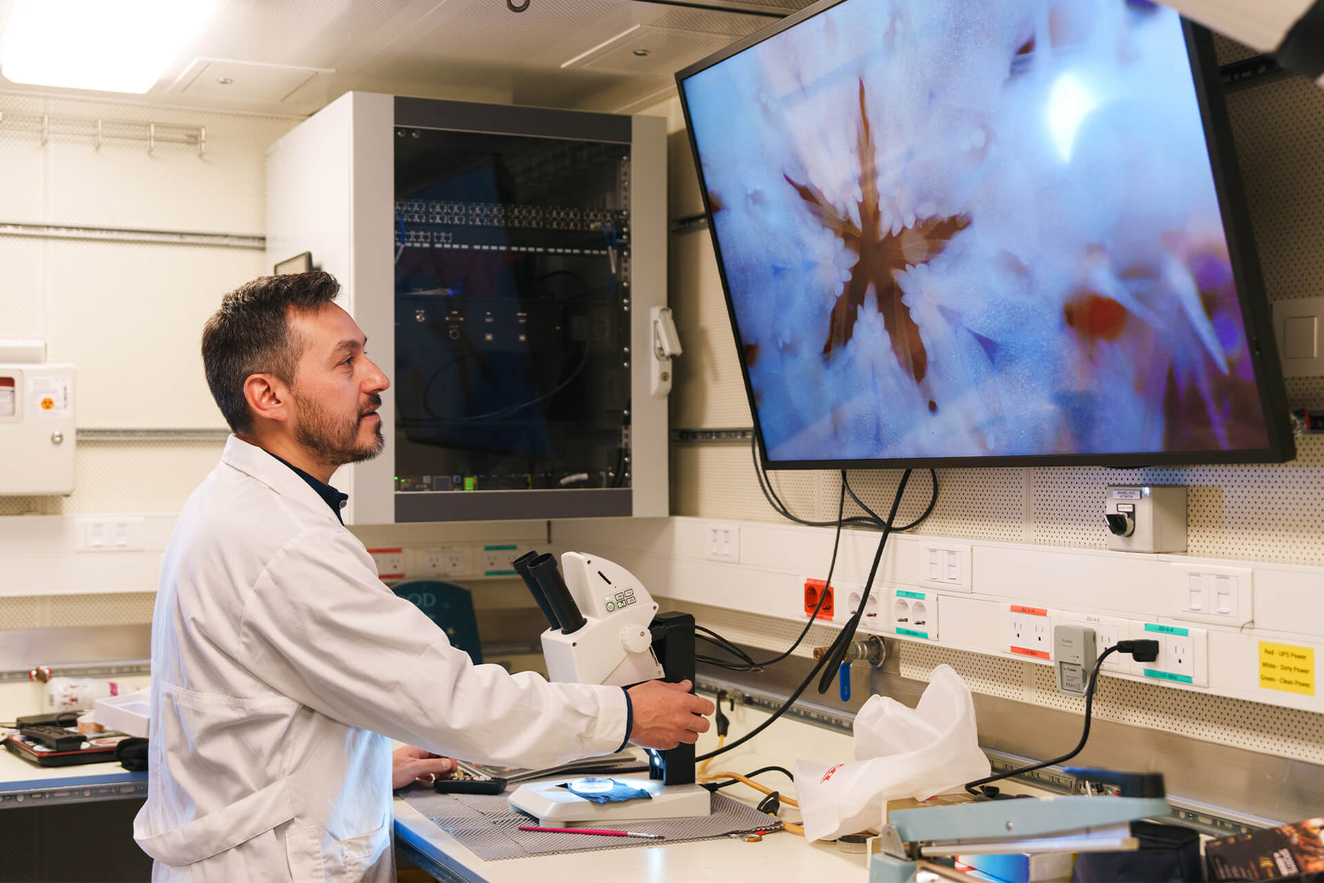 Sediment corers and other sampling equipment are used to retrieve seafloor sediments, rocks and biological material, while specialised nets and continuous plankton recorders collect life directly from the water column. Onboard laboratories and cold storage allow many of these samples to be examined, processed or preserved at sea before further analysis on land.
