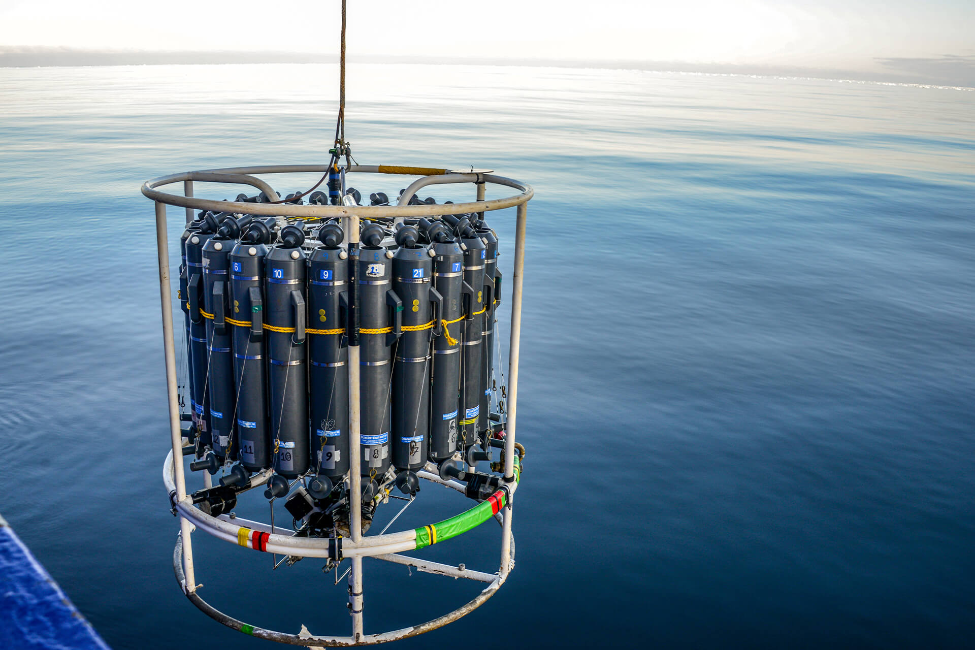 During research voyages, instruments operating from the vessel measure conditions throughout the water column, along with plankton and other small life moving through it. Some instruments record continuously as the ship moves, while others collect water or biological samples for later analysis.